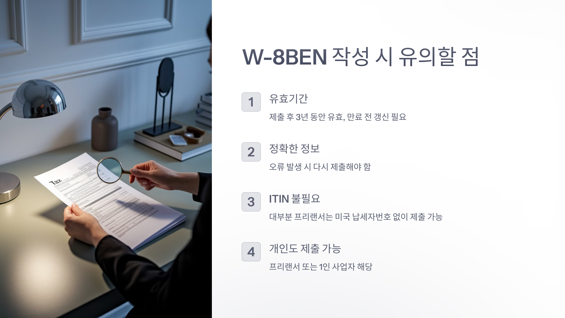 🔹 팁: IRS 공식 웹사이트에서 최신 W-8BEN 양식을 다운로드할 수 있으며, 정확한 내용을 기재해야 합니다.
