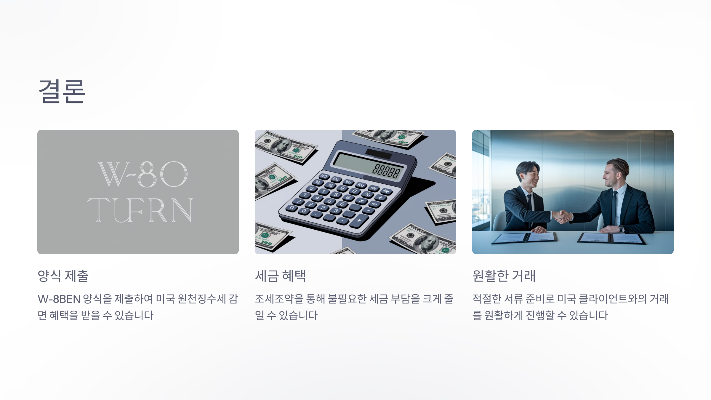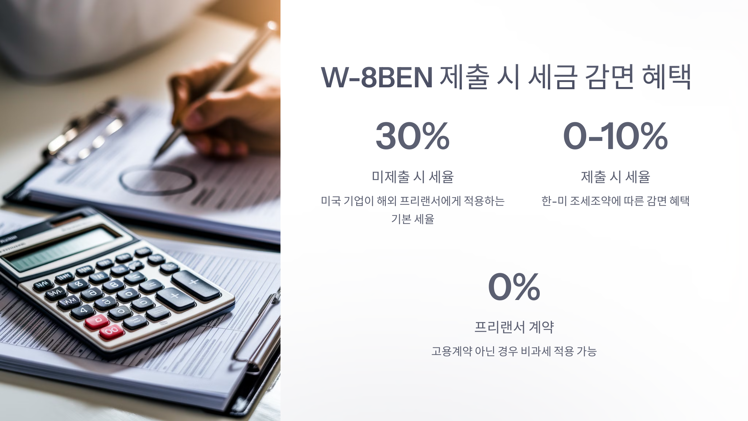 🔹 팁: 한국과 미국은 조세 조약을 맺고 있어, 프리랜서 및 개인사업자는 0% 또는 10% 세율 적용 가능