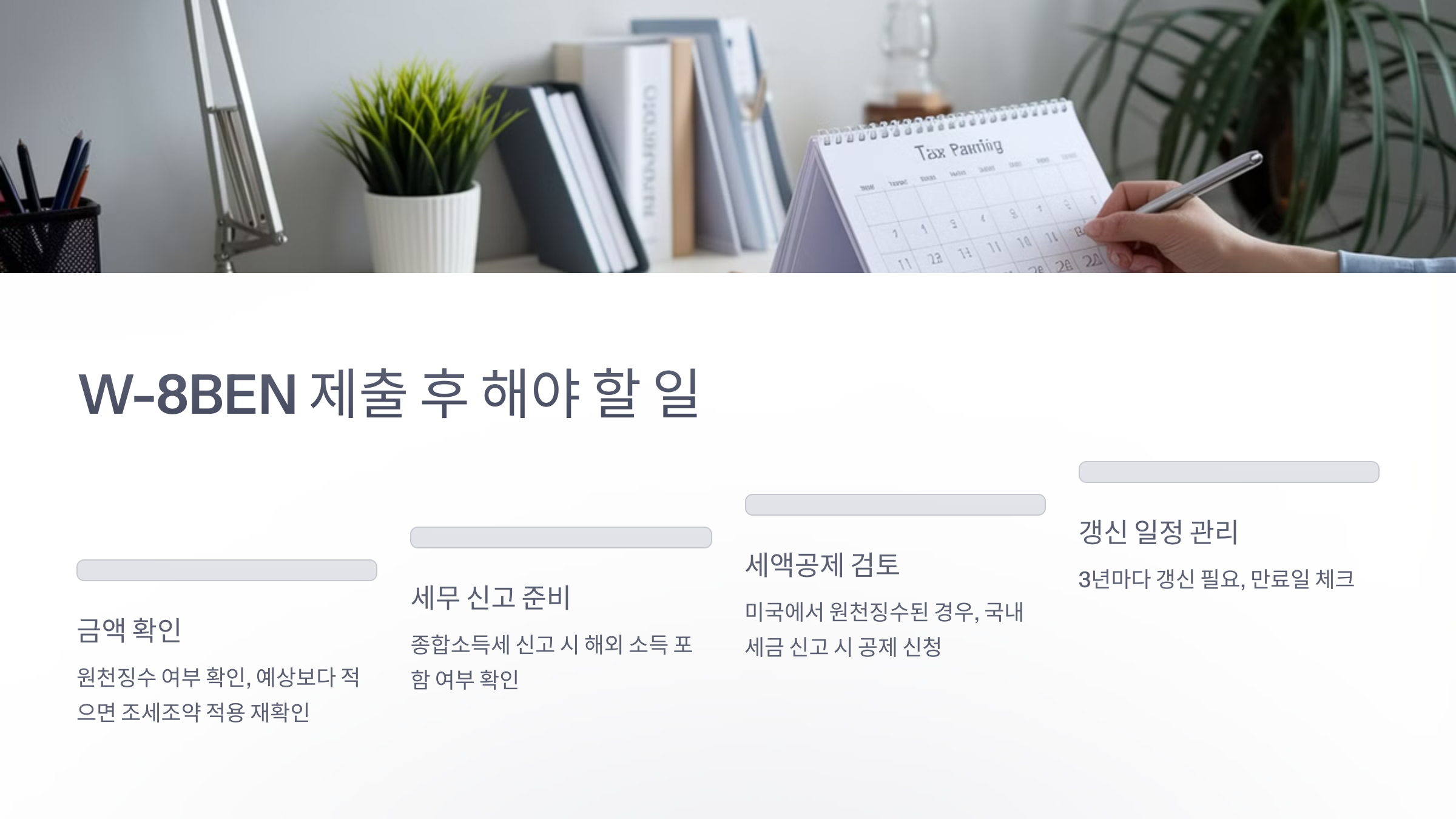 🔹 팁: W-8BEN 제출 후에도 미국에서 원천징수가 발생했다면, 외국납부세액공제를 활용해 국내에서 세액 공제를 받을 수 있습니다.