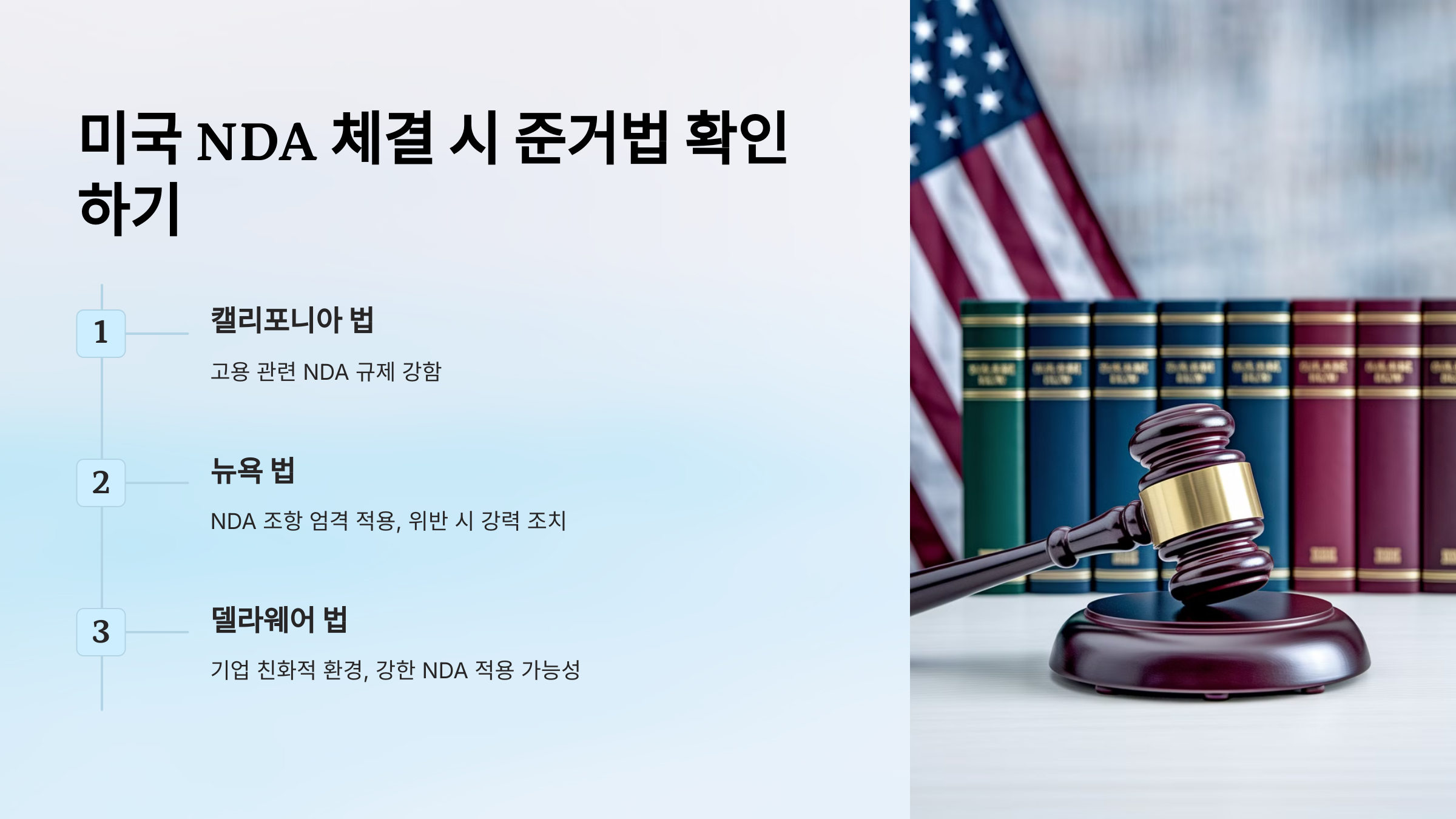 미국에서 체결하는 NDA는 어느 주(State)의 법을 따르는지에 따라 효력이 달라질 수 있습니다.
