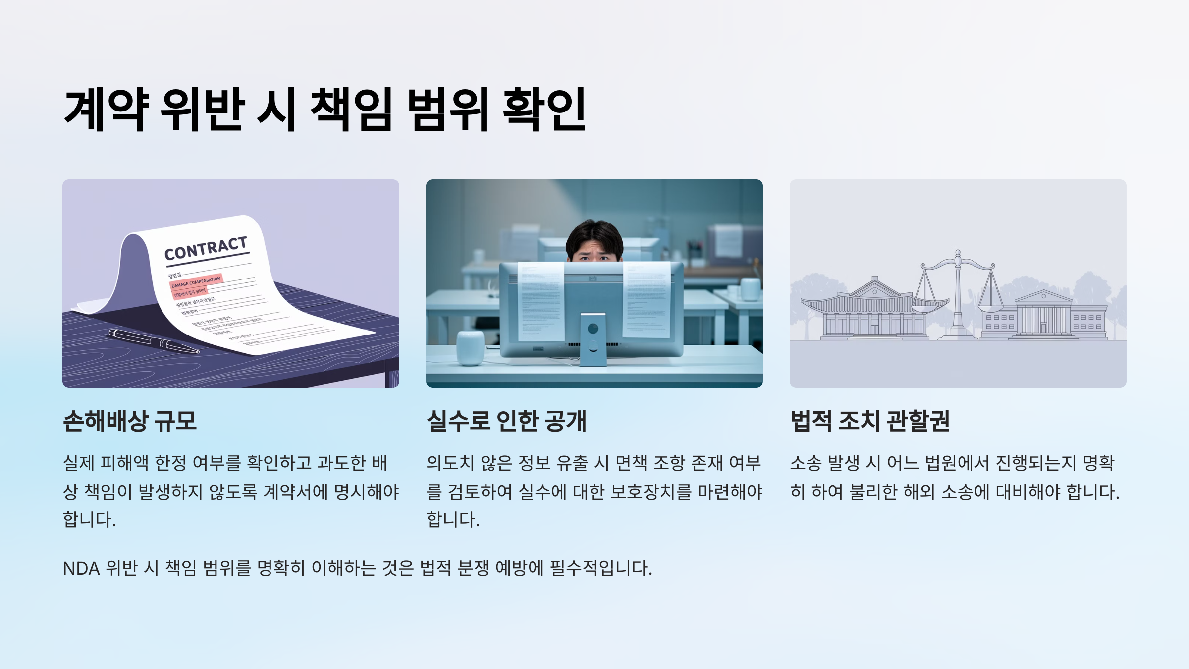 NDA를 위반할 경우, 손해 배상 청구나 소송 가능성이 있으므로 책임 범위를 명확히 해야 합니다.
