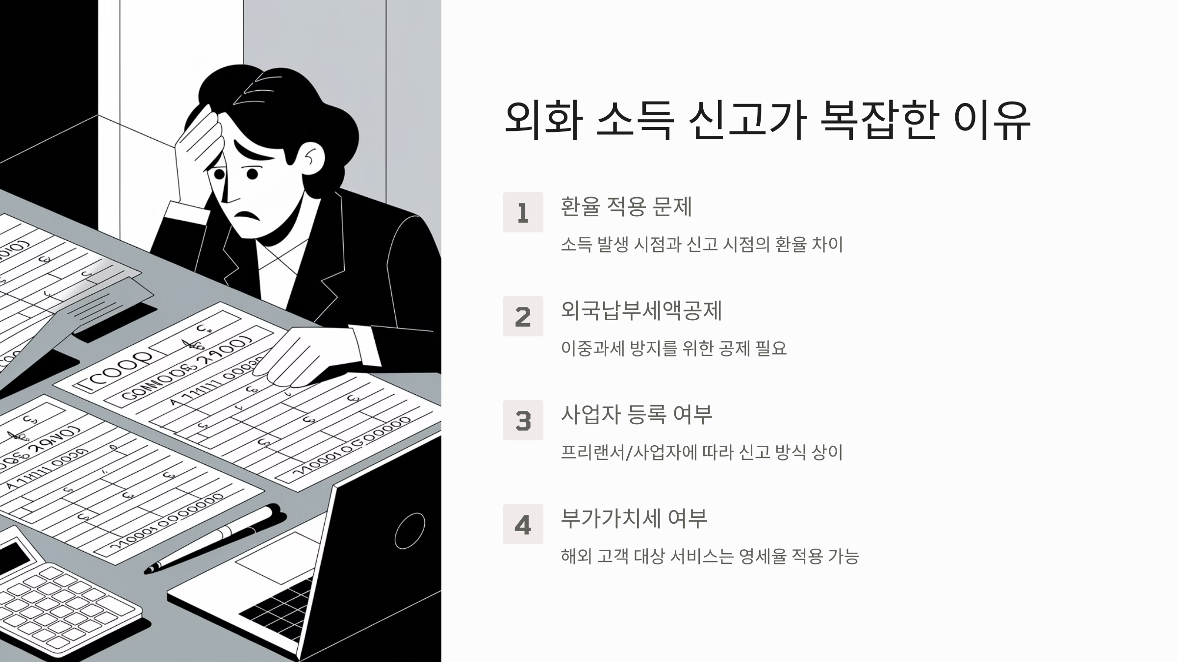 외화 소득자는 국내 소득과 달리 환율 변동, 해외 세금 공제, 부가가치세 적용 여부 등을 고려해야 합니다.