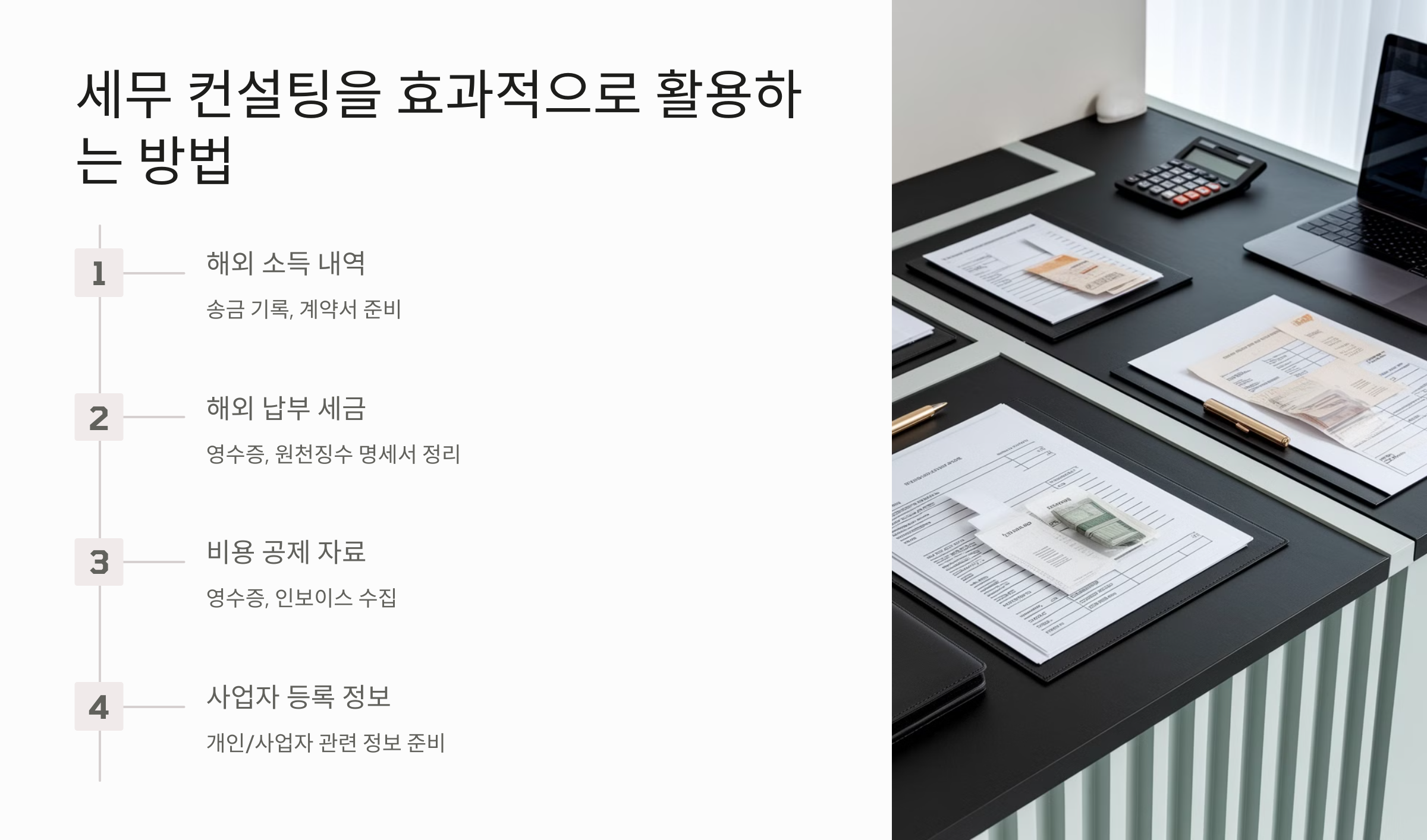 🔹 팁: 미리 필요한 자료를 정리하면 상담 시간이 단축되고, 보다 정밀한 절세 전략을 세울 수 있습니다.