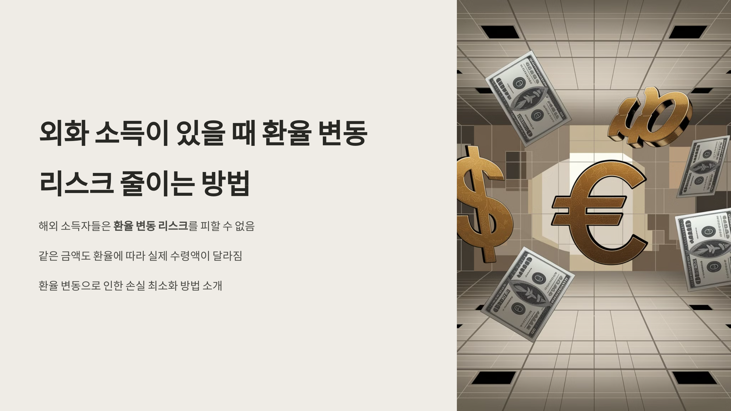 해외에서 소득을 올리는 프리랜서, 원격 근무자, 수출업체들은 환율 변동에 따른 리스크를 피할 수 없습니다. 같은 금액을 벌더라도 환율에 따라 실제 수령하는 금액이 달라질 수 있기 때문입니다. 이번 글에서는 외화 소득이 있을 때 환율 변동으로 인한 손실을 최소화하는 방법을 소개합니다.