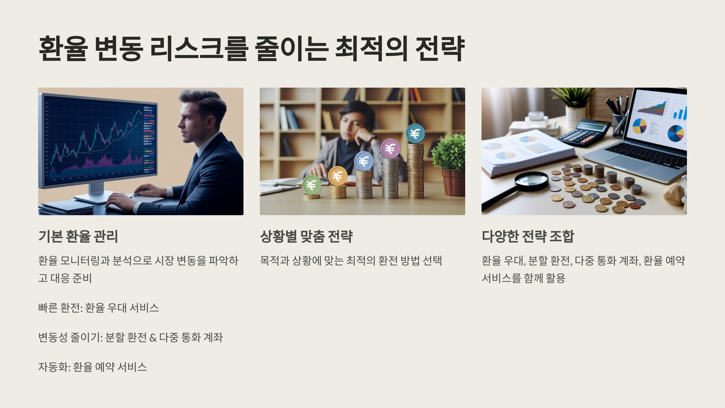 🔹 포인트: 환율이 불리할 때는 외화를 보관하고, 유리할 때만 환전하면 환차손을 줄일 수 있습니다.