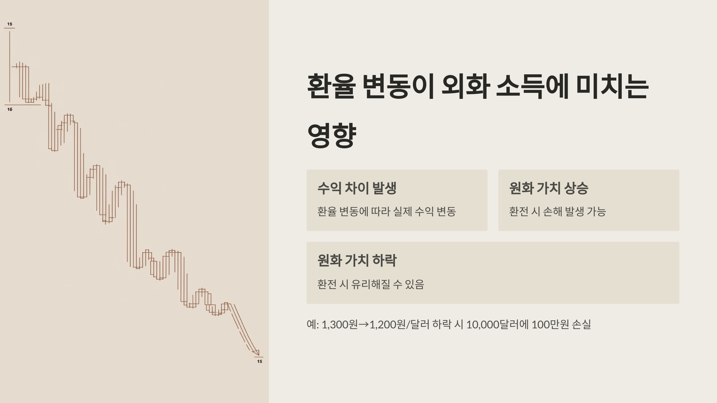 외화 소득을 보유하고 있다면 환율 변동에 따라 실제 수익이 변할 수 있습니다. 특히 원화 가치가 상승하면 환전 시 손해를 볼 수 있고, 원화 가치가 하락하면 유리할 수 있습니다.