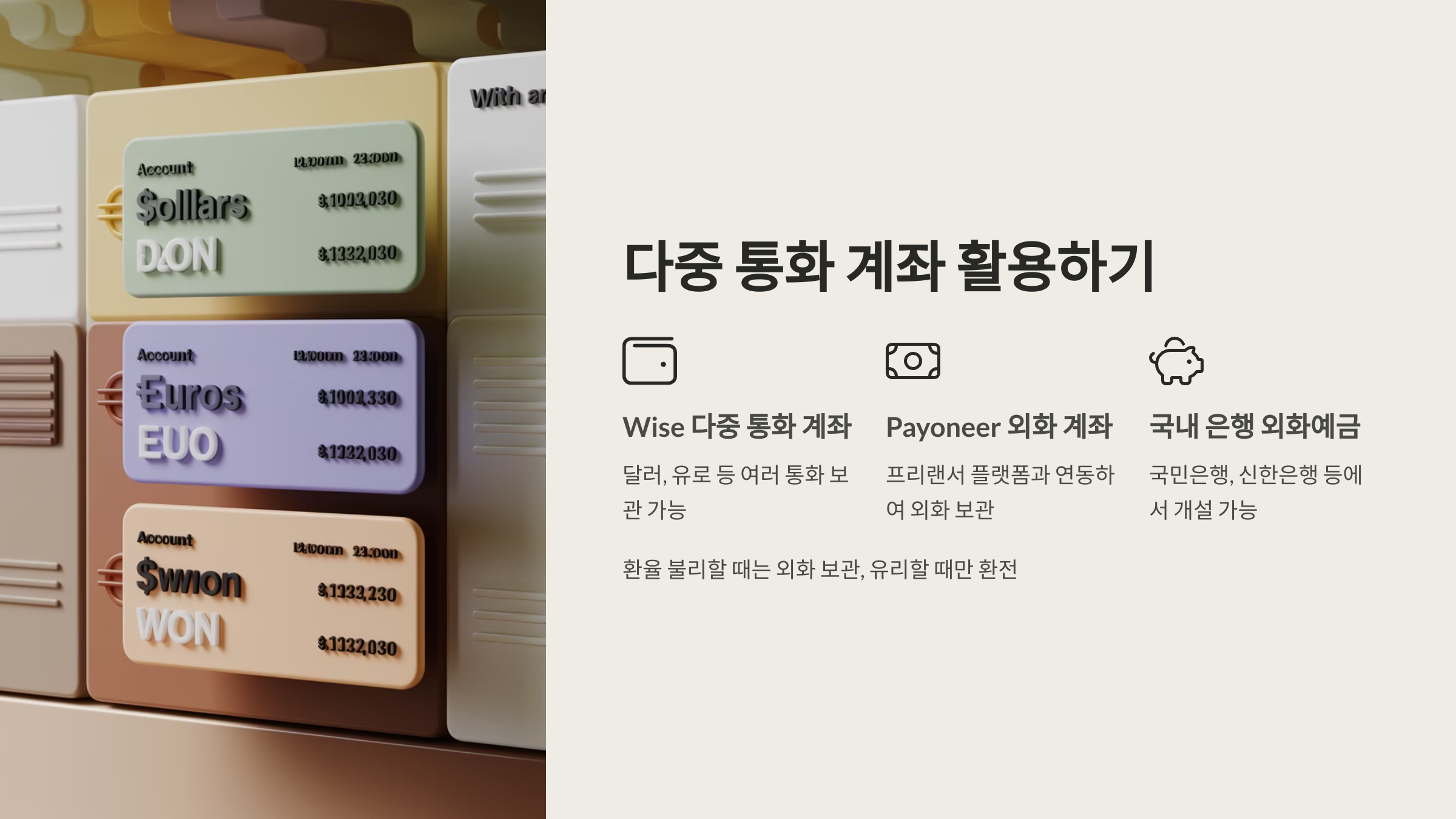 해외 은행이나 핀테크 서비스를 활용하여 외화를 그대로 보관하고, 환율이 유리할 때만 환전하는 전략입니다.