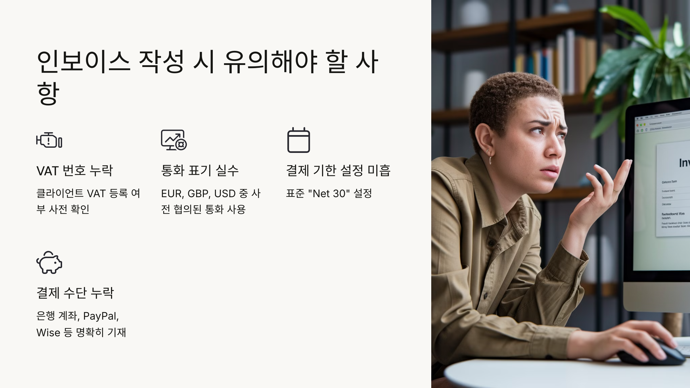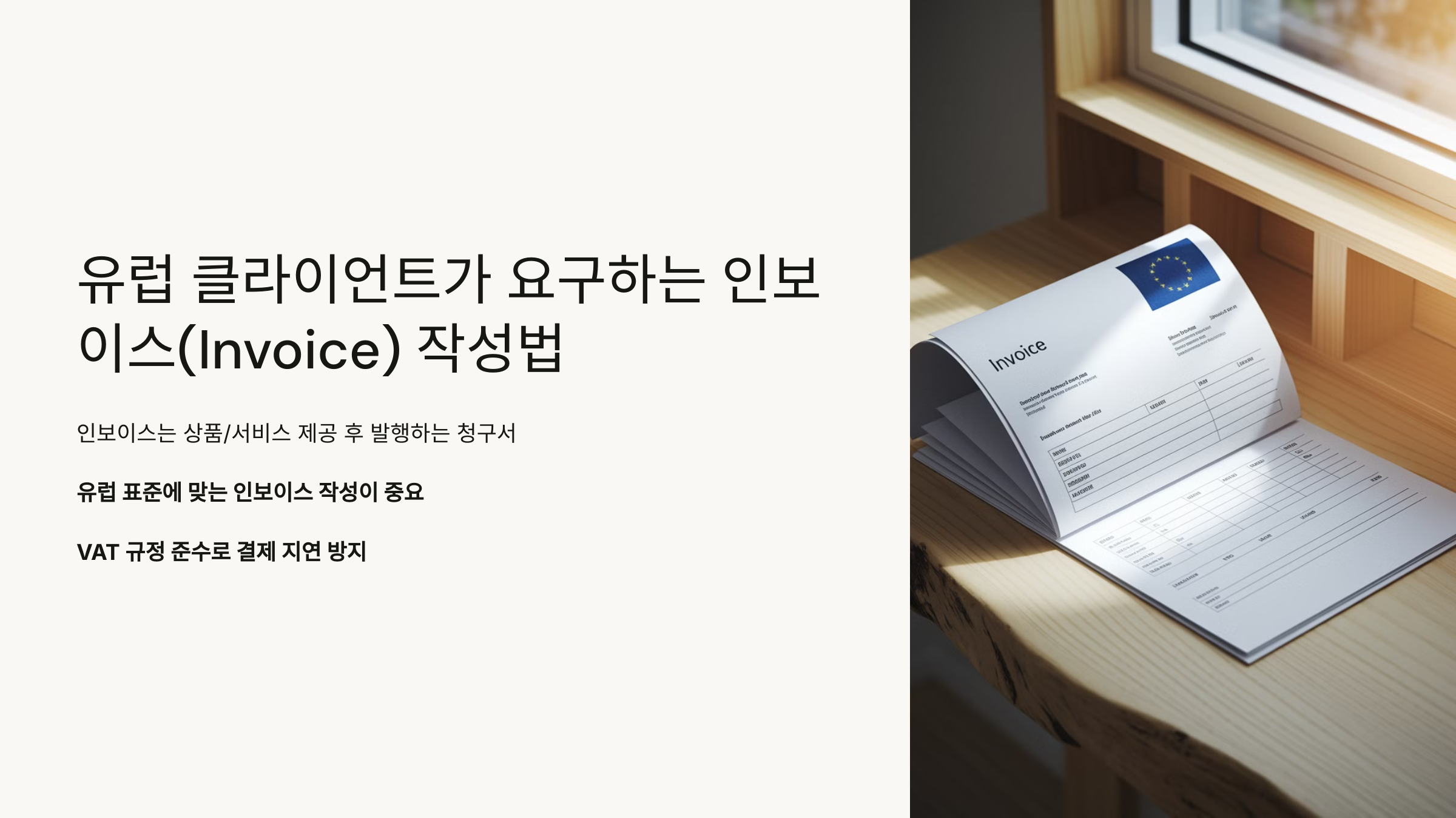 유럽 클라이언트와 원활한 거래를 위해서는 올바른 인보이스 형식을 준수하고, VAT 및 결제 관련 정보를 명확히 제공하는 것이 중요합니다. 😊