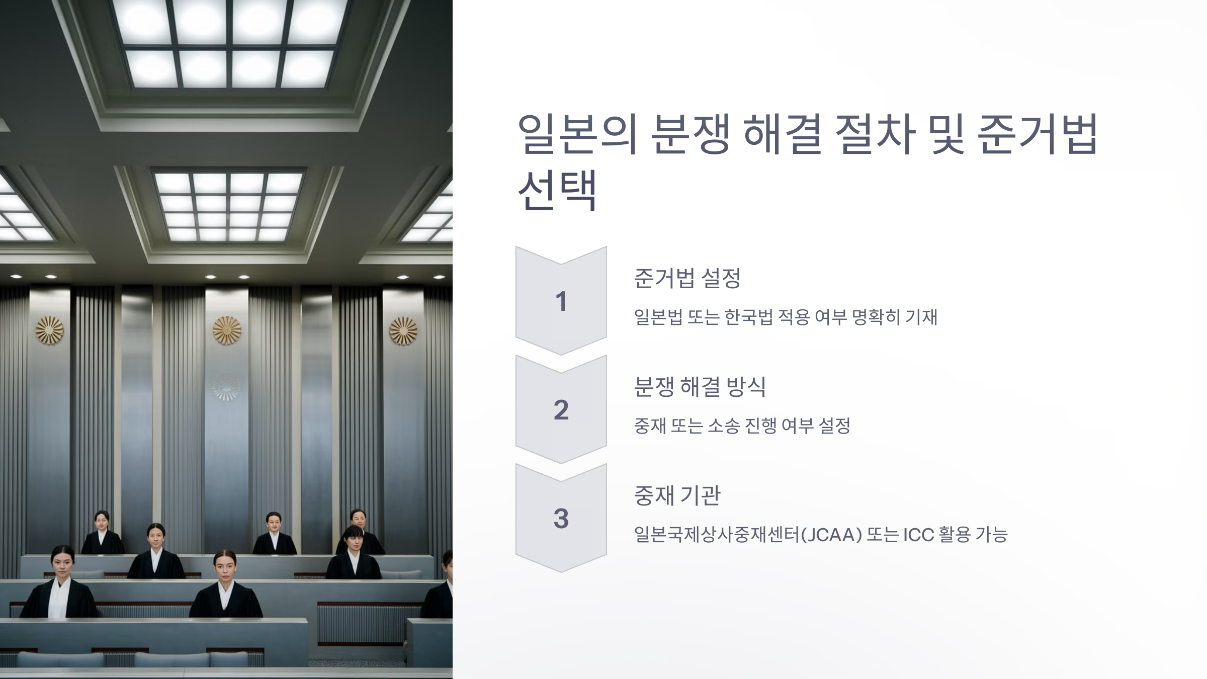 - 일본국제상사중재센터(JCAA) 또는 ICC(국제상업회의소) 활용 가능