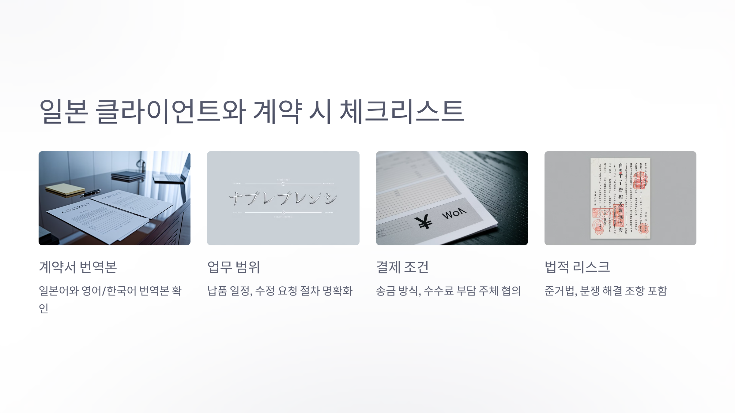 일본 클라이언트와 계약할 때는 명확한 계약서 작성과 법적 리스크 관리가 필수적입니다. 일본 법률과 세금 규정을 충분히 이해하고 계약을 체결하면, 더욱 안정적인 협업이 가능합니다. 😊