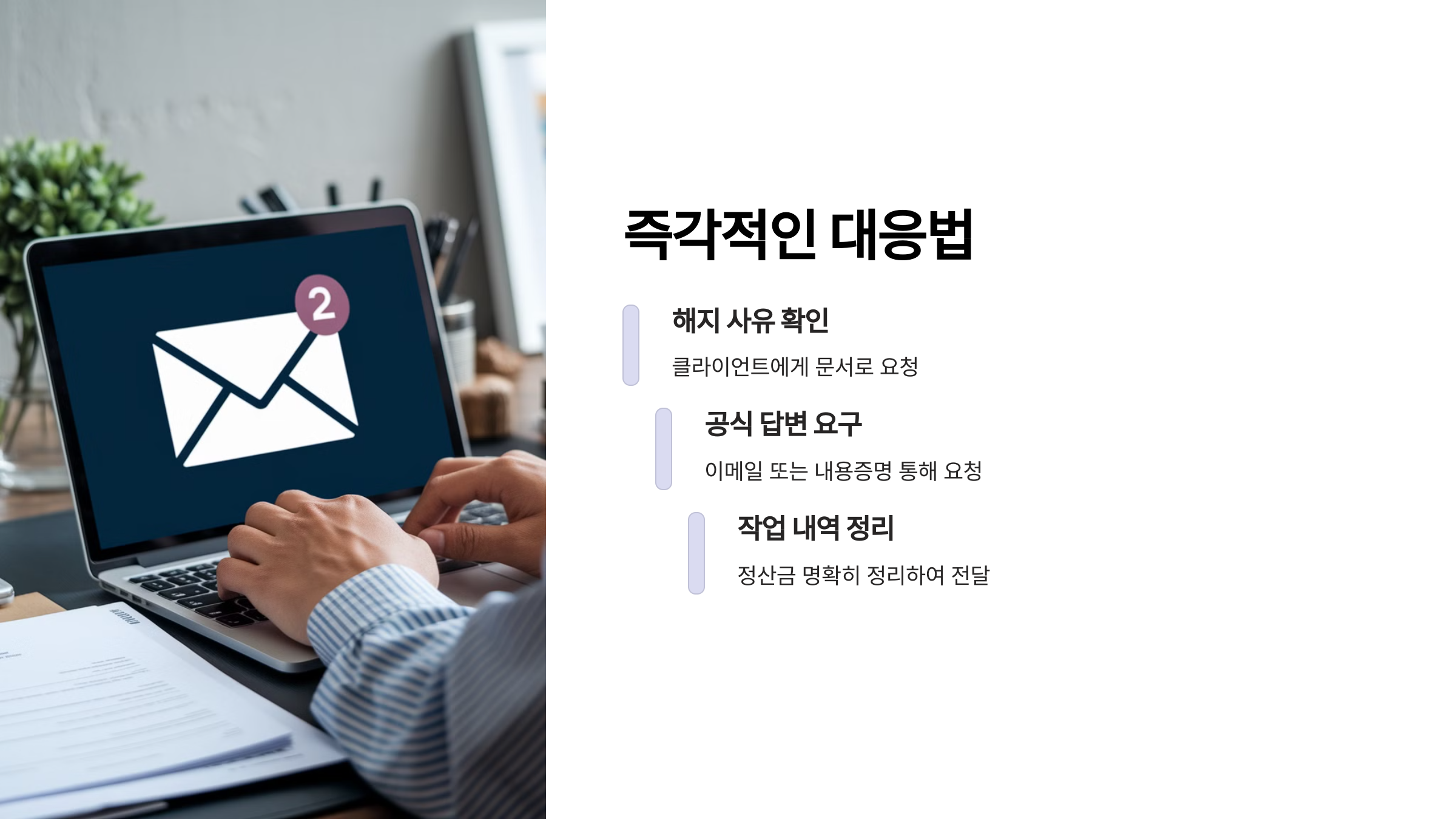 ✔️ 클라이언트에게 해지 사유 및 대금 정산을 공식적으로 요청하세요.
