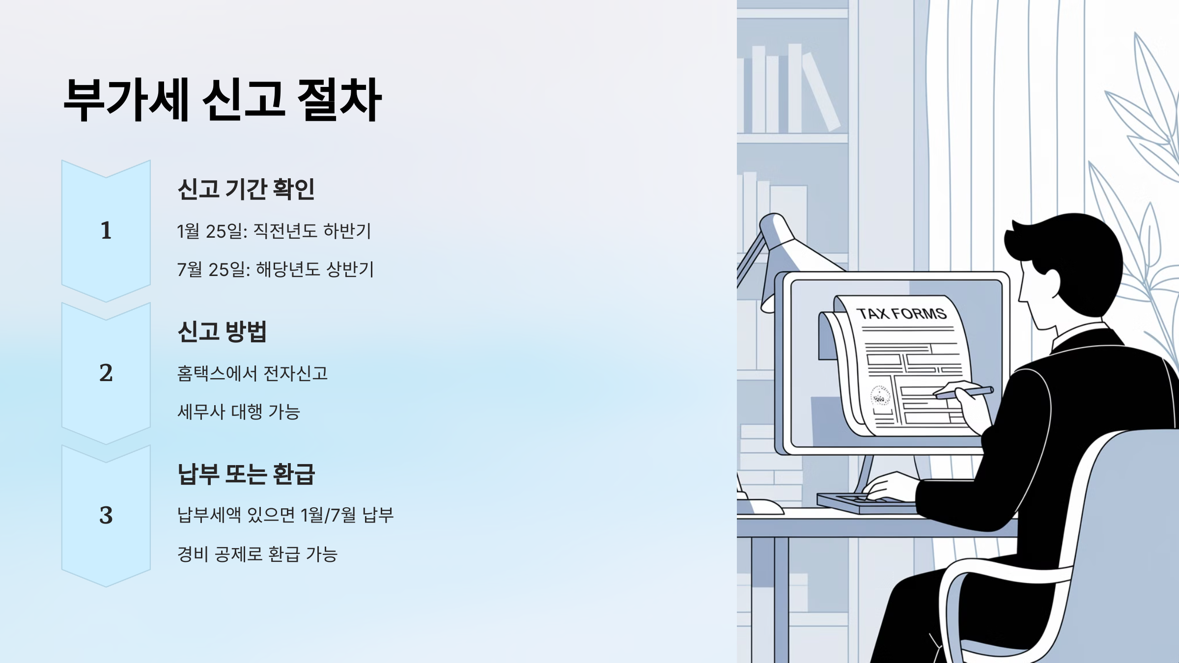 • 7월 25일: 해당년도 상반기(1~6월) 부가세 신고