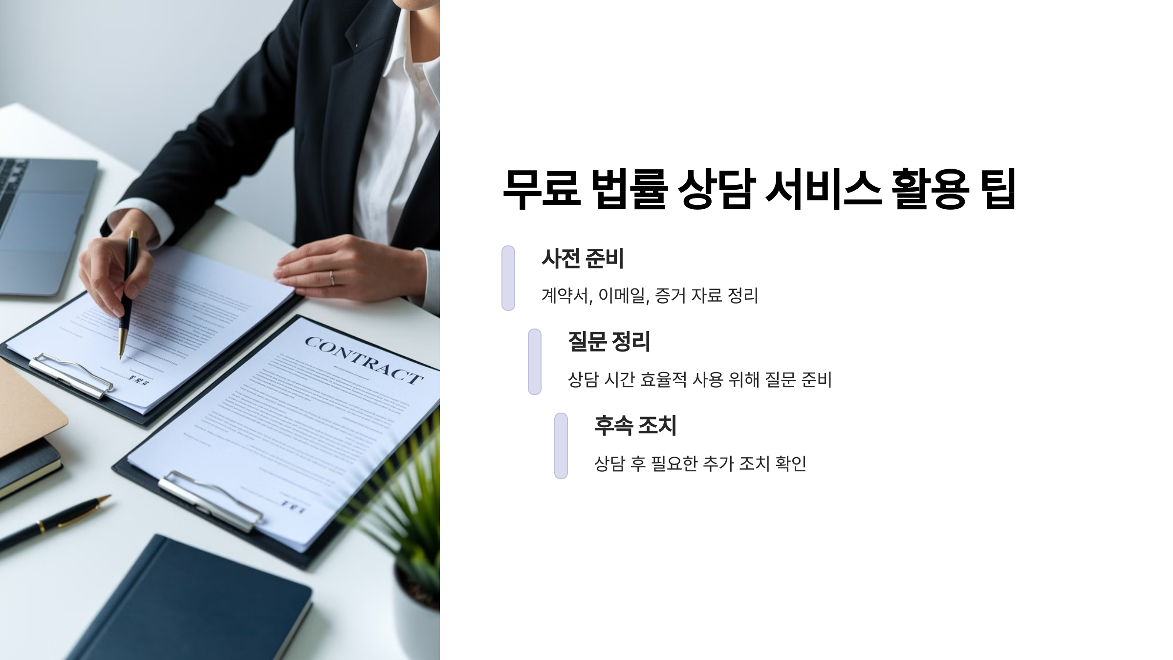 🔹 후속 조치 확인: 상담 후 필요한 추가 조치를 확인하고, 법률 전문가의 조언을 따르세요.