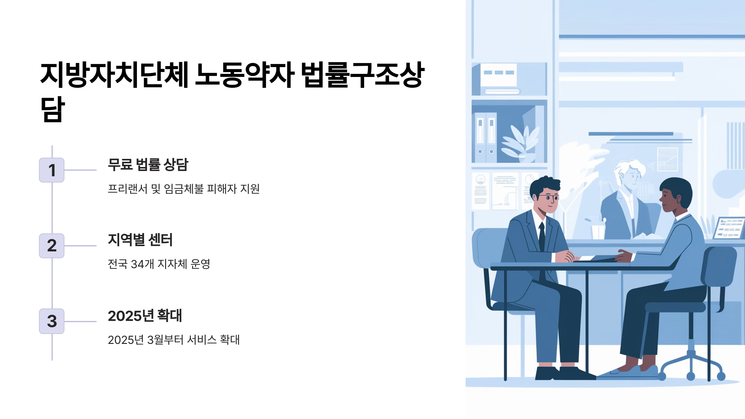 지방자치단체에서도 노동 취약계층을 위한 법률 상담을 제공합니다. 2025년 3월부터 전국 34개 지방자치단체에서 임금 체불, 계약 분쟁 등과 관련한 무료 법률 상담을 받을 수 있습니다.