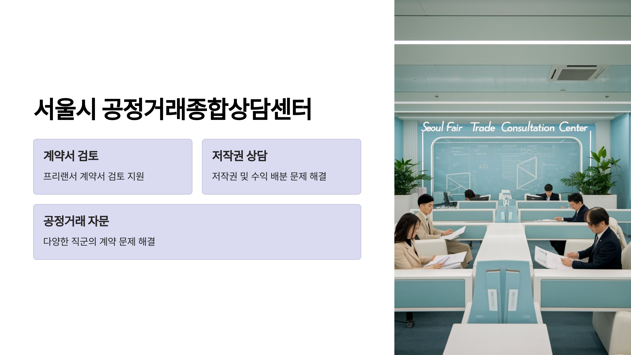 서울시에서 운영하는 공정거래종합상담센터는 프리랜서, 예술인 등 다양한 직군의 계약 문제를 해결하는 데 도움을 줍니다. 특히 계약 해지 조항이나 저작권 관련 문제에 대한 전문적인 상담을 받을 수 있습니다.