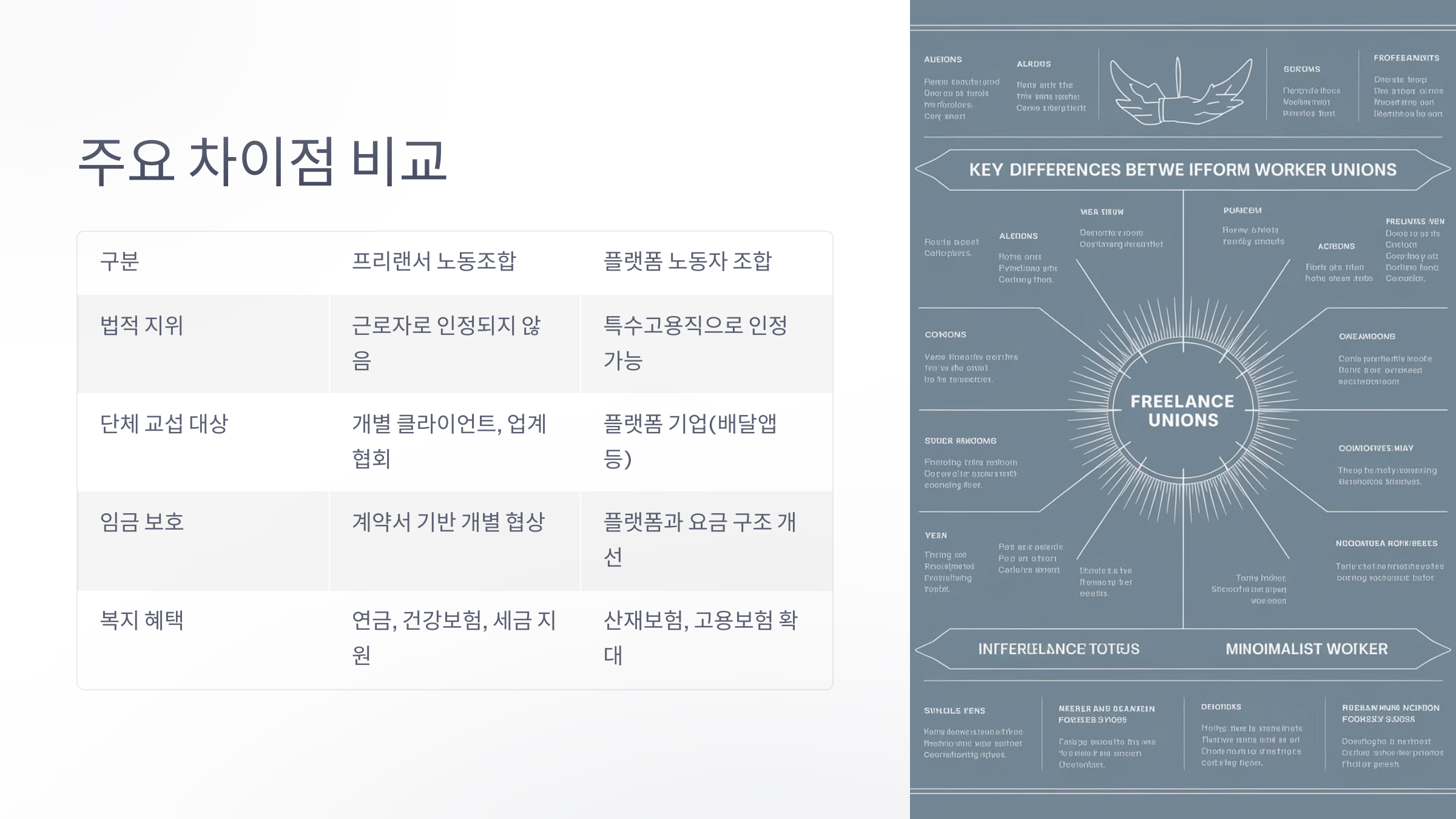 📌 2. 프리랜서 노동조합 vs. 플랫폼 노동자 조합 – 주요 차이점 비교