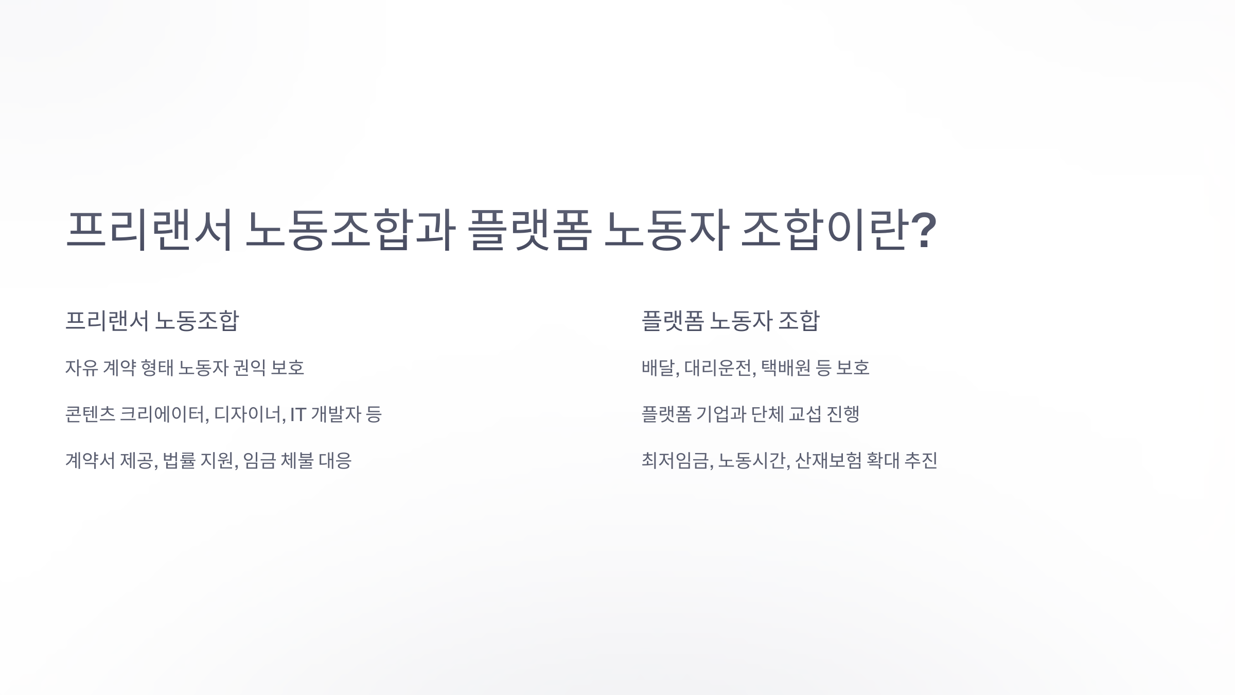 | 단체 교섭 대상 | 개별 클라이언트, 업계 협회 | 플랫폼 기업(배달앱, 모빌리티 서비스 등) |