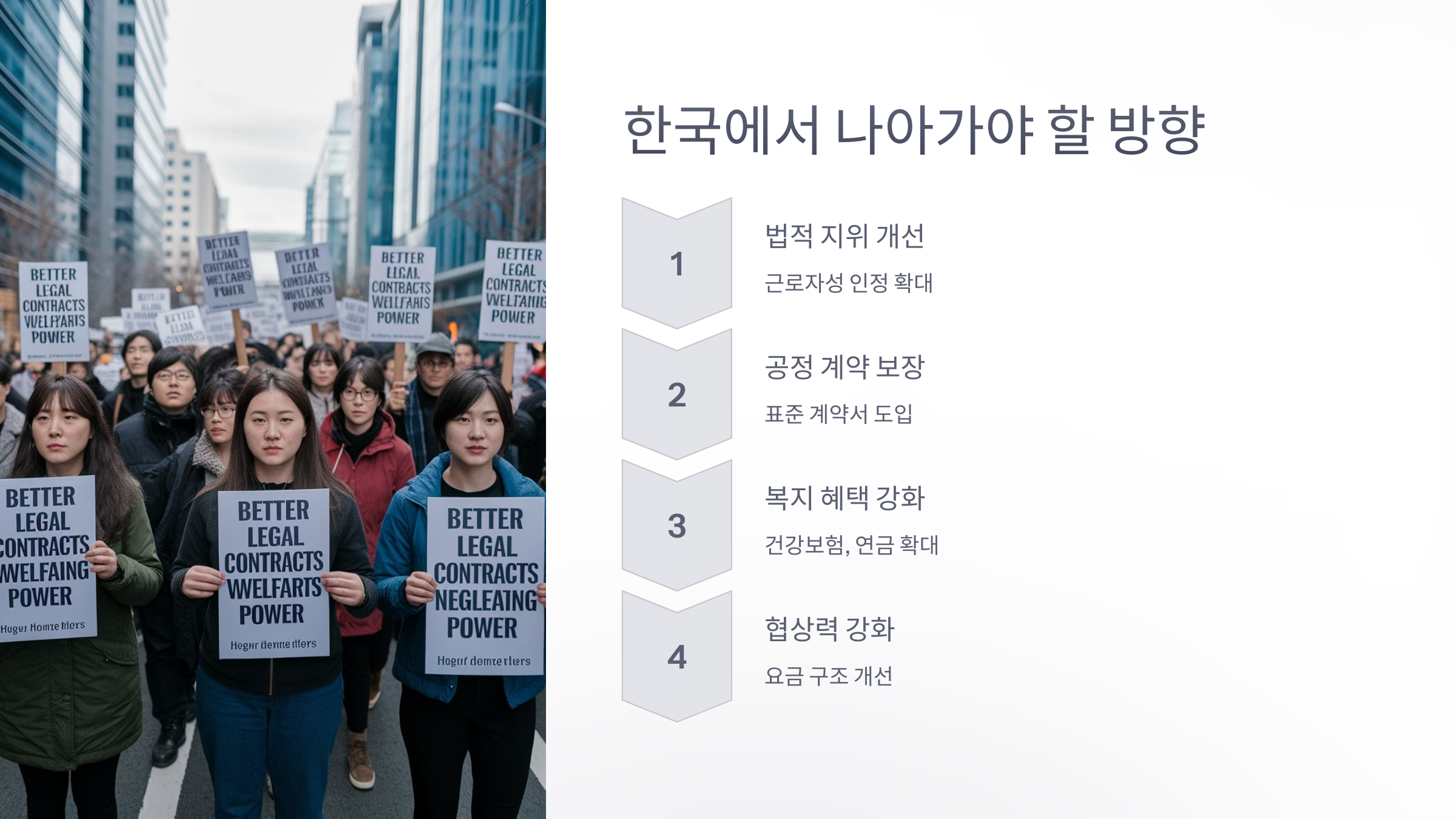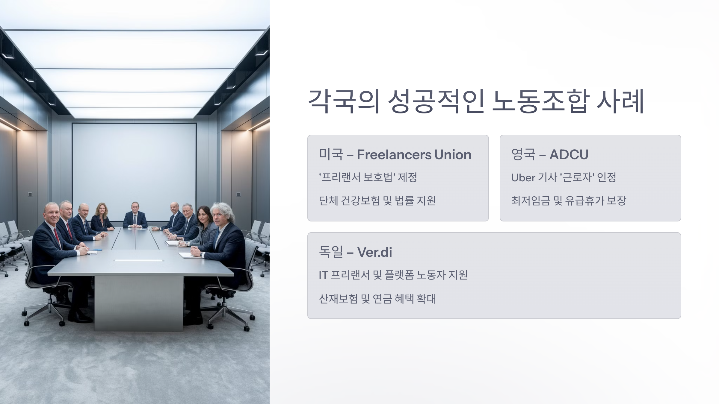 💡 결론: 해외에서는 프리랜서와 플랫폼 노동자를 위한 법적 보호 및 단체 교섭이 활발하게 이루어지고 있음.