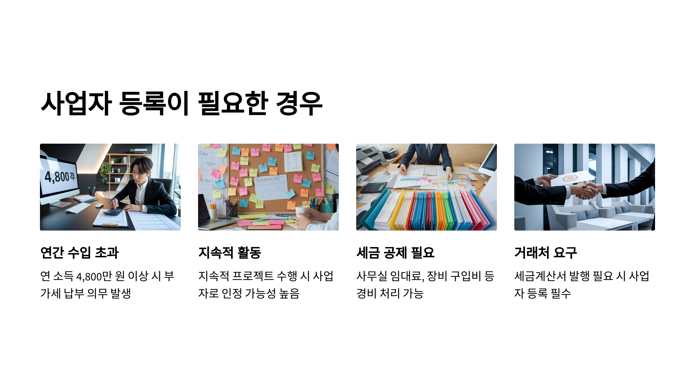 국세청 기준으로 부가가치세법상 사업자는 일정한 소득이 발생할 경우 사업자 등록을 해야 합니다. 일반적으로 연 소득이 4,800만 원 이상이면 부가세 납부 의무가 발생하므로 사업자 등록이 필요합니다.