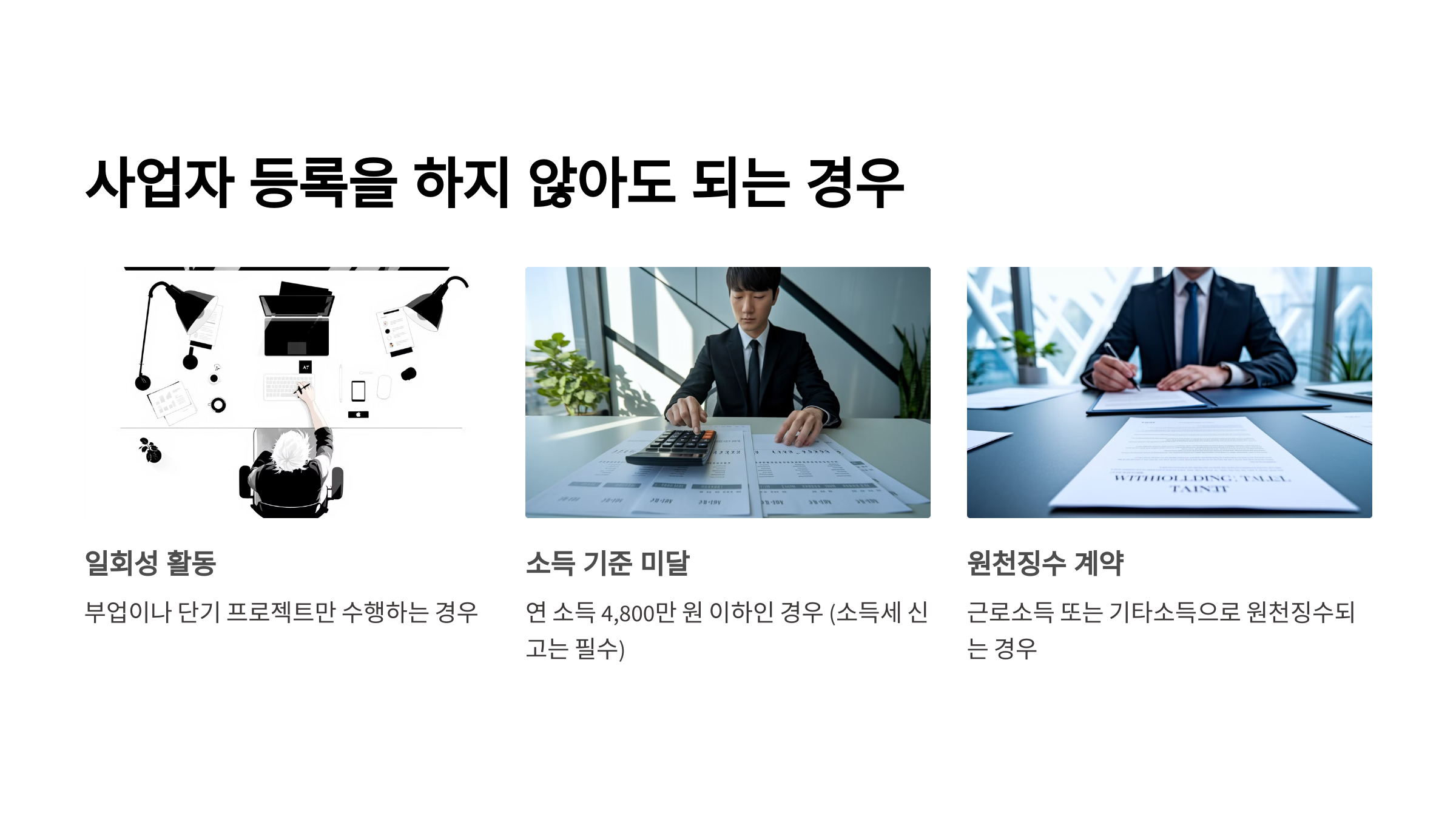 일부 프리랜서 계약은 사업소득이 아닌 근로소득 또는 기타소득으로 원천징수됩니다. 이 경우에는 사업자로 인정되지 않으며, 사업자 등록 없이도 소득세 신고만 하면 됩니다.