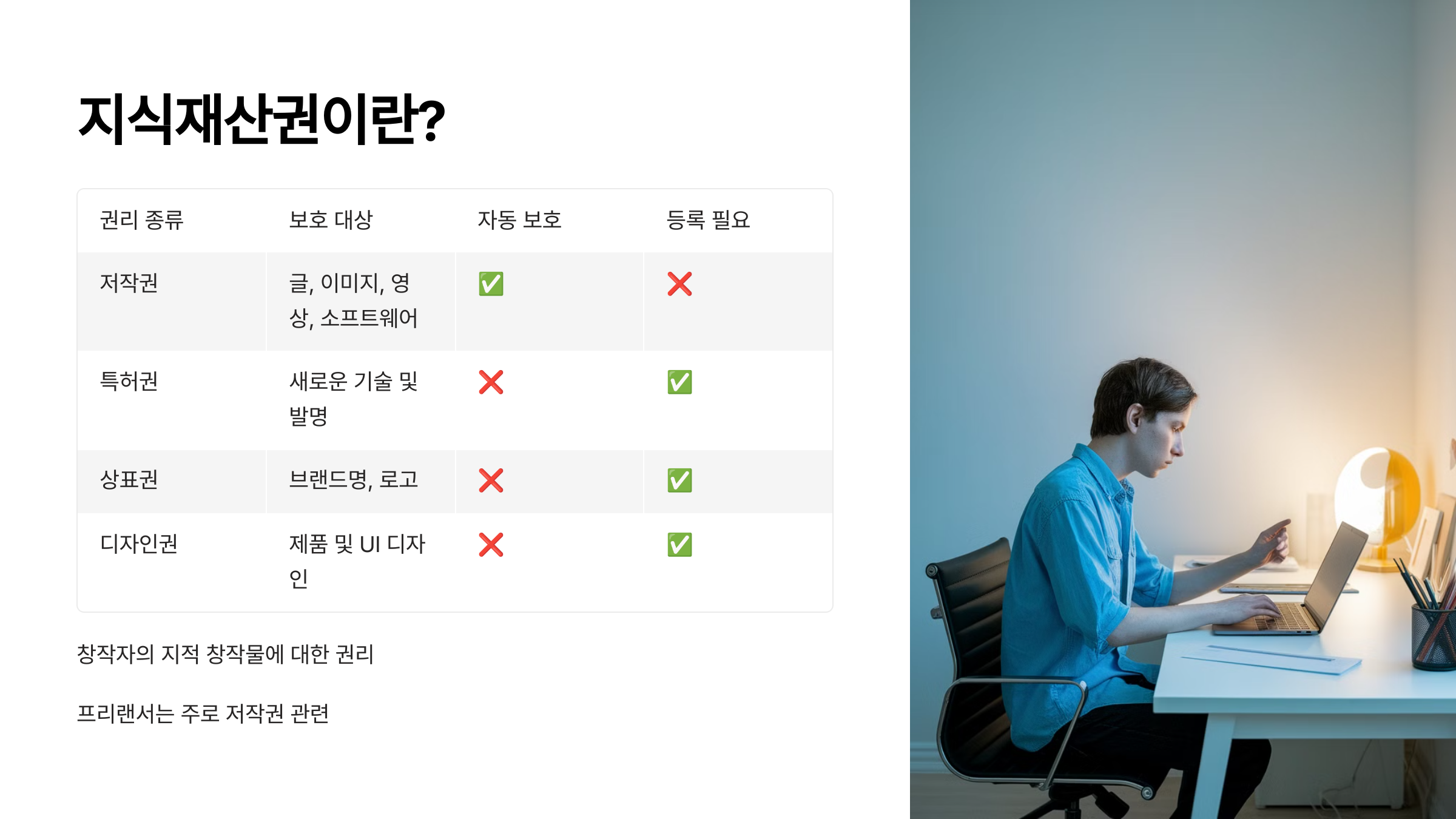 | 저작권 | 글, 이미지, 영상, 소프트웨어 등 | ✅ 자동 보호 (창작과 동시에) | ❌ 등록 선택사항 |