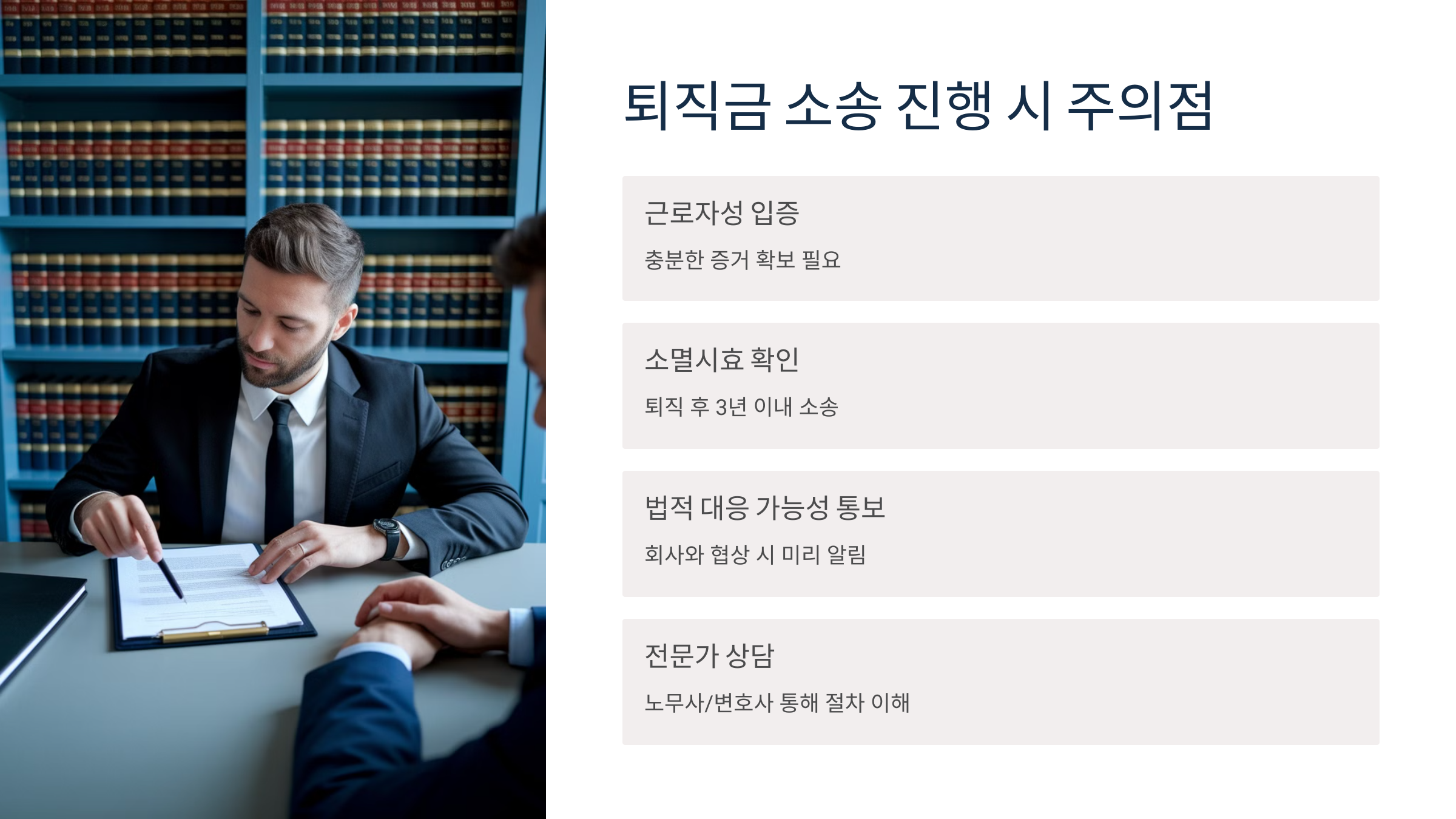 퇴직금 소송을 진행하기 전, 몇 가지 유의해야 할 사항이 있습니다.