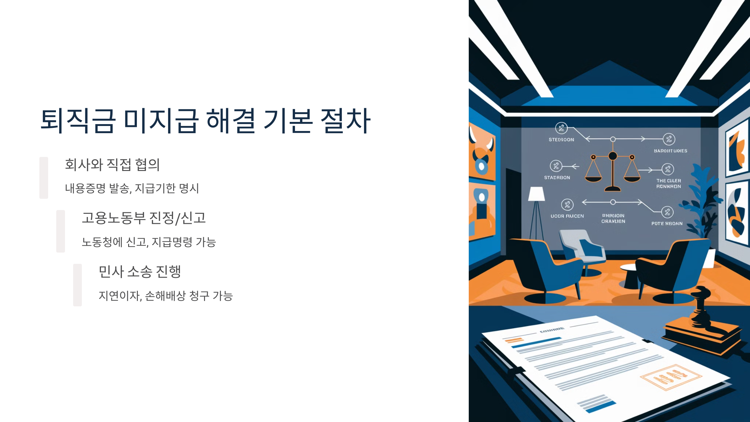 퇴직금을 받기 위해서는 단계적으로 대응하는 것이 중요합니다. 기본적인 해결 절차는 다음과 같습니다.