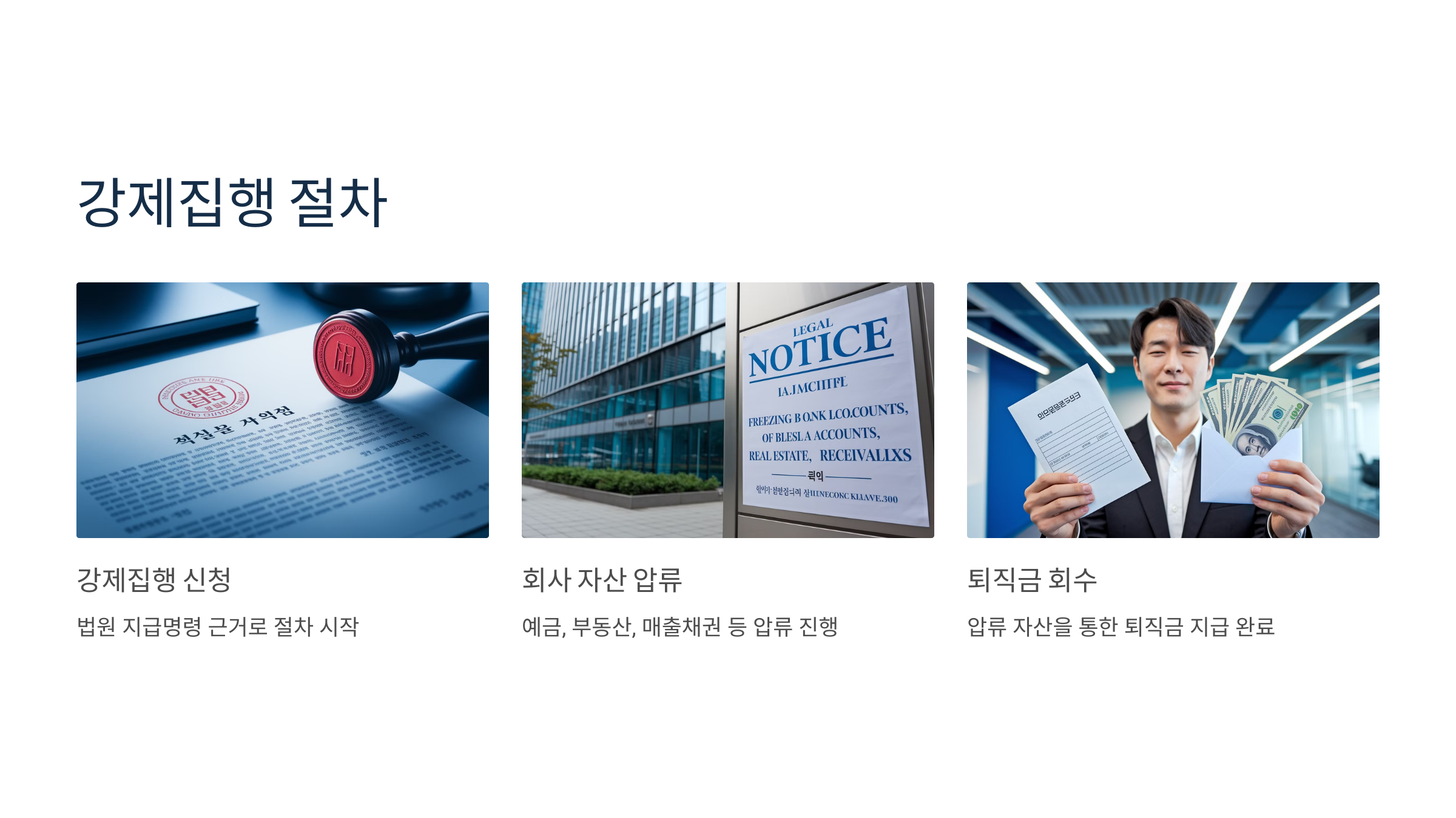 강제집행은 법원의 판결이 확정된 후에도 지급이 이루어지지 않을 때 활용하는 방법으로, 회사의 재산을 대상으로 법적 압류 조치를 할 수 있습니다.