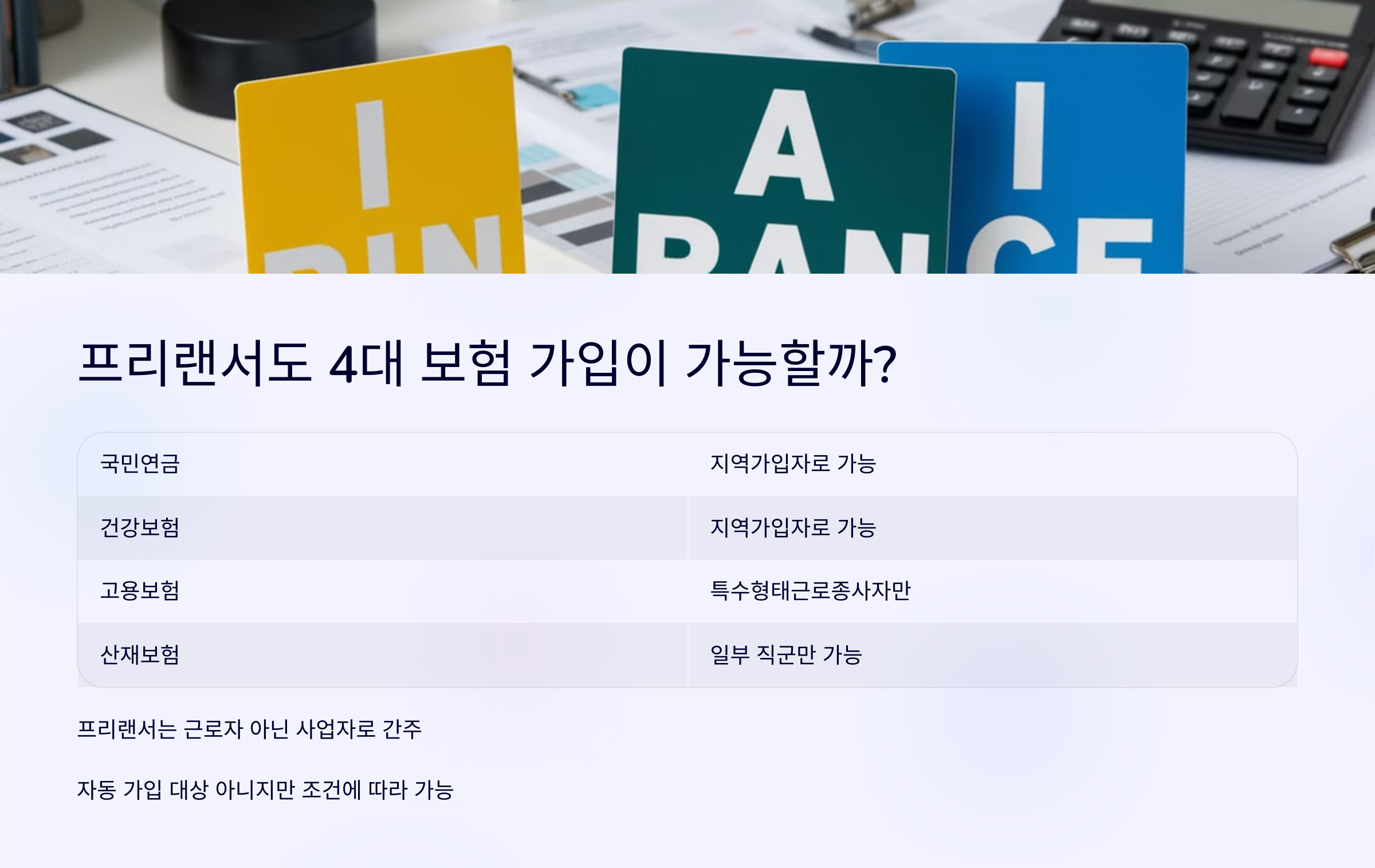 ⚠️ 일부 보험 가입 불가: 고용보험과 산재보험은 모든 프리랜서가 가입할 수 없음