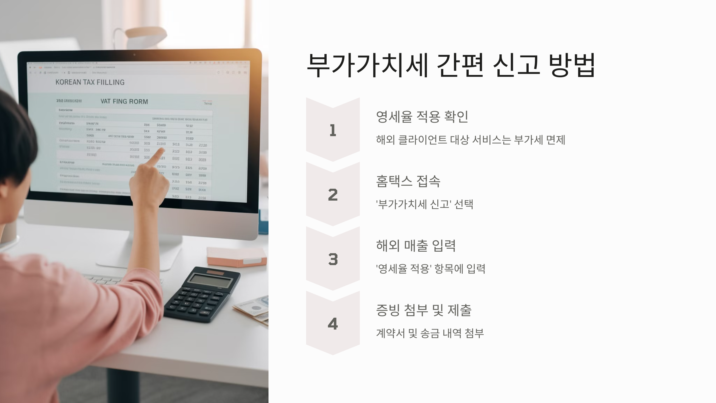 해외 클라이언트에게 제공한 서비스는 부가가치세 영세율(0%) 적용 가능하므로, 이를 활용하면 불필요한 세금 부담을 줄일 수 있습니다.