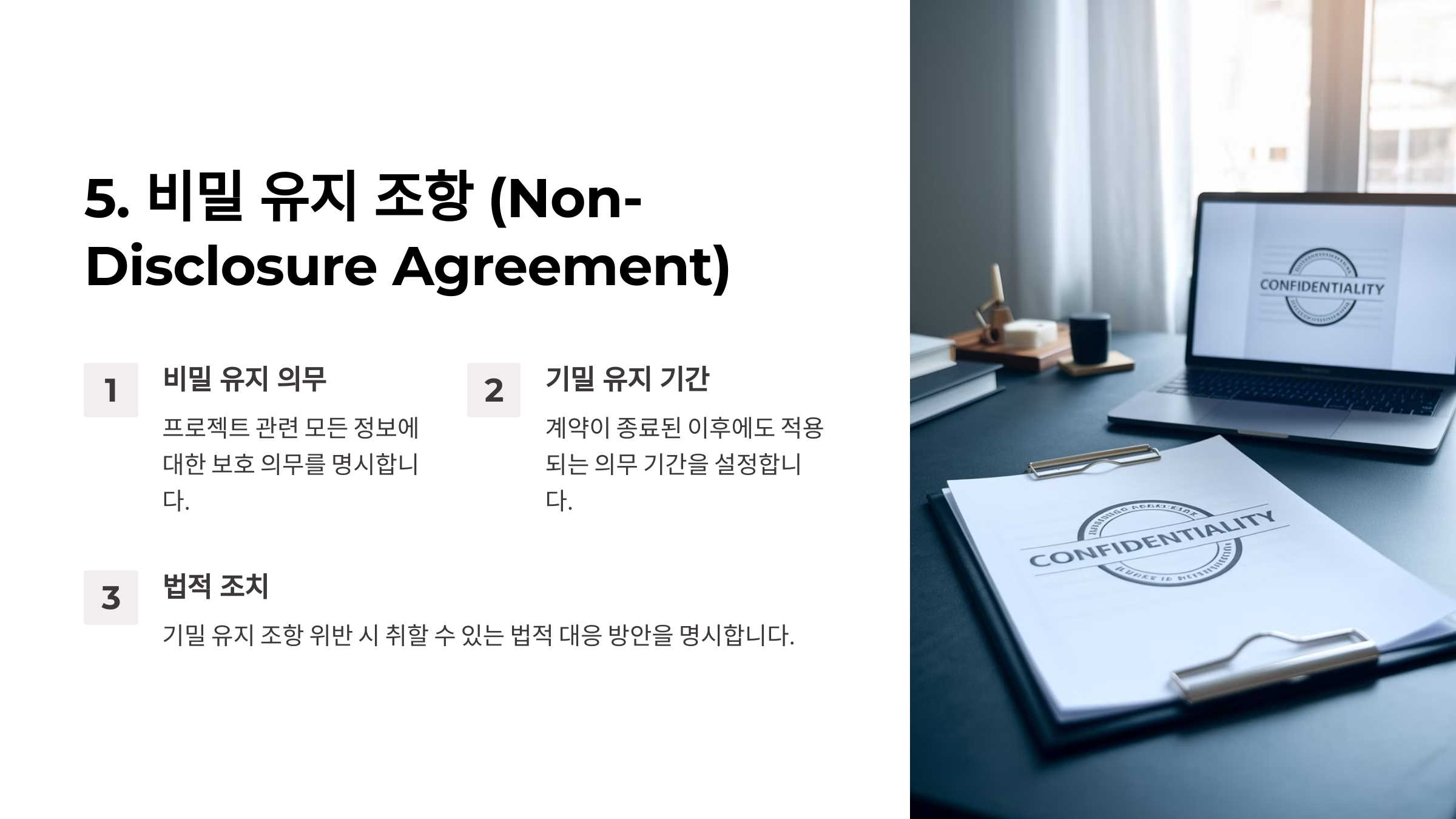 ✅ 5. 비밀 유지 조항 (Non-Disclosure Agreement, NDA)