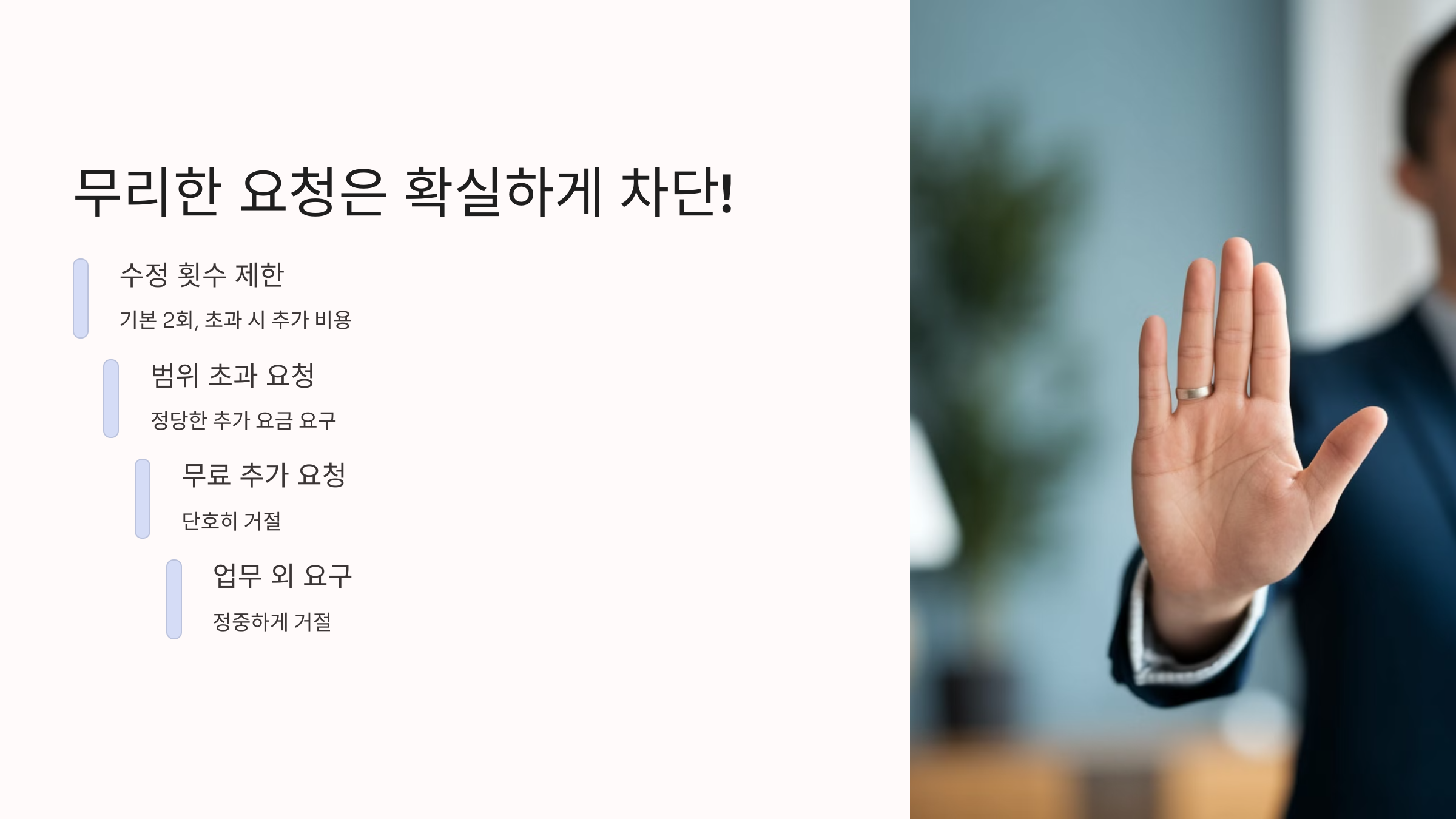 ✔️ 업무 외 요구(추가 작업, 마케팅 지원 등) 정중하게 거절