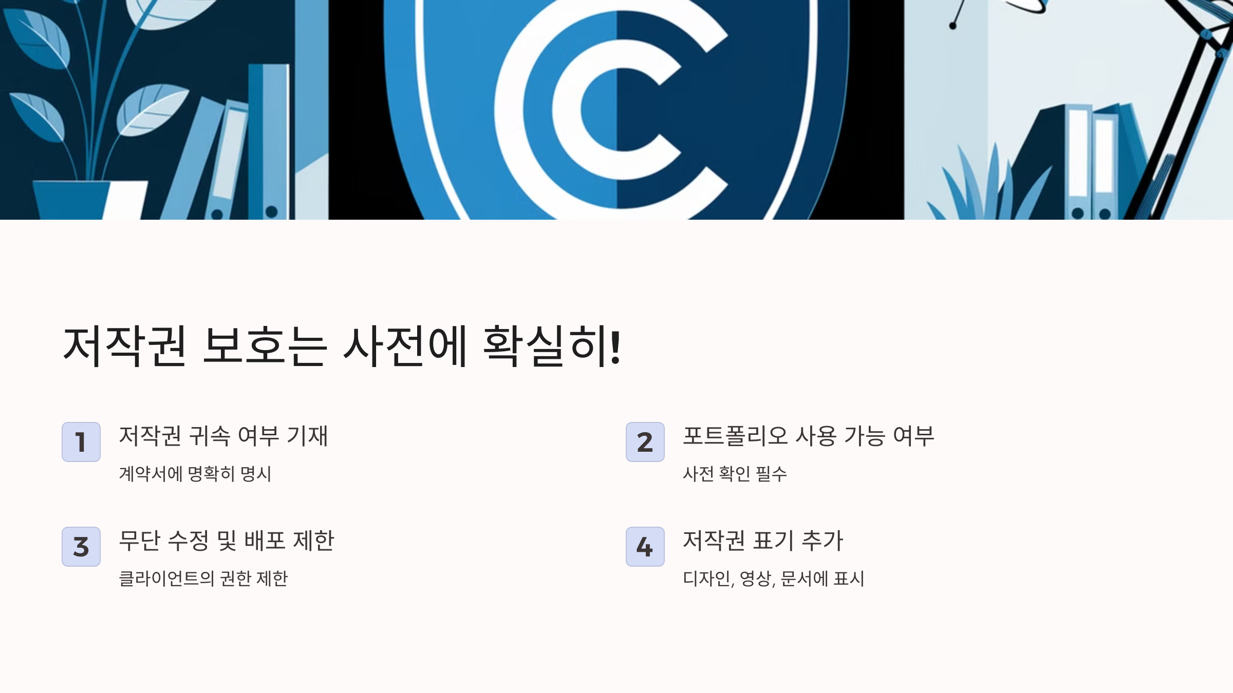📌 TIP: 계약서 없이 진행된 작업의 저작권은 원칙적으로 프리랜서에게 귀속됩니다. (저작권법 제9조)