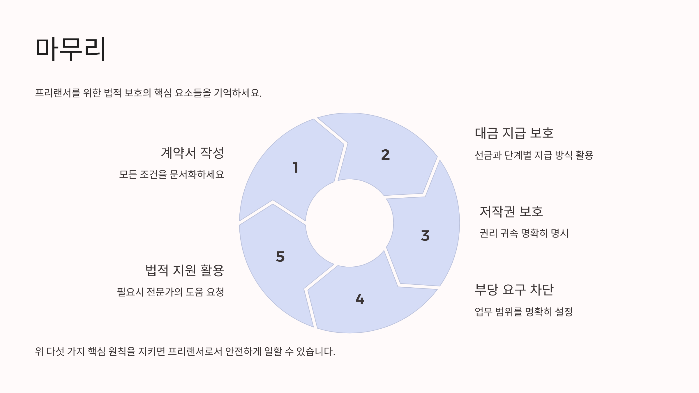 프리랜서는 개인 사업자이기 때문에 계약 관리, 대금 지급 보호, 저작권 보호, 부당 요청 차단, 법적 지원 활용 등의 법적 보호 전략을 반드시 숙지해야 합니다.